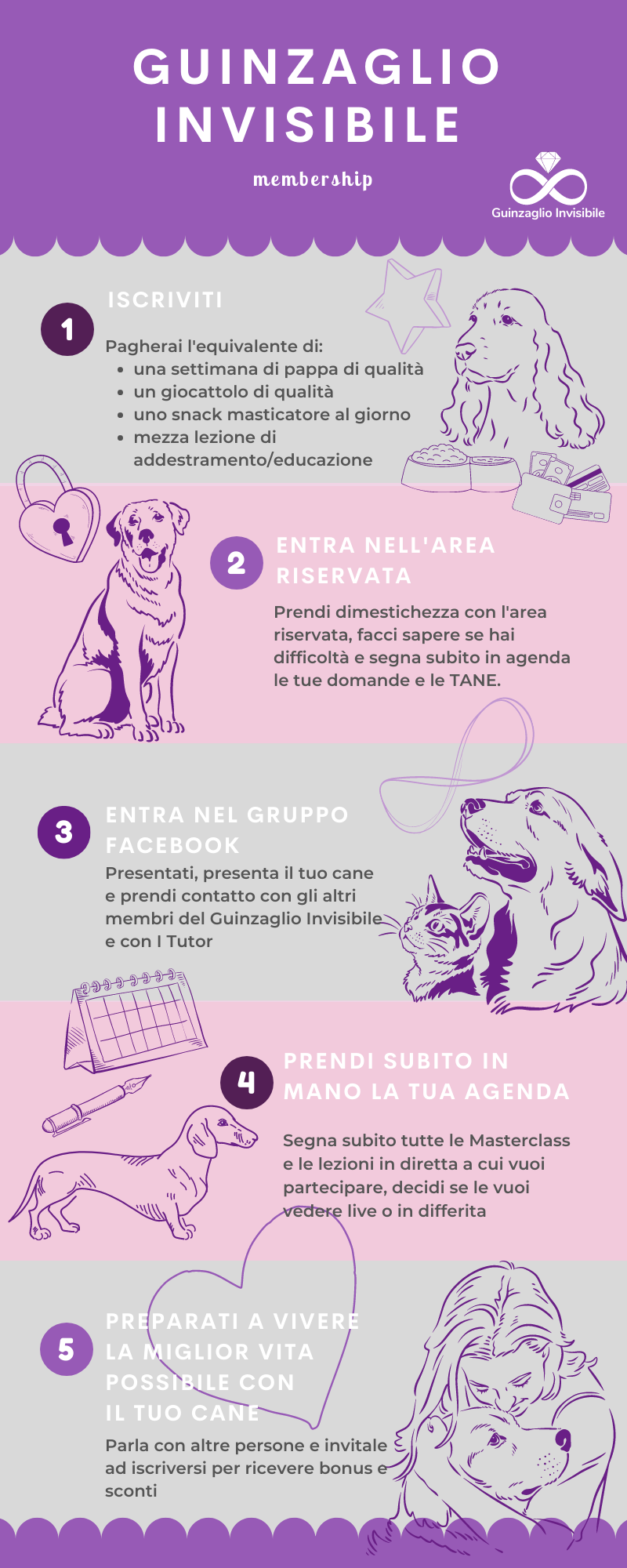 Guinzaglio Invisibile è una Membership, ovvero una serie di contenuti riservati ai soli membri in cui vengono approfondite tematiche importanti riguardo il mondo del cane ma non solo l’educazione che è una semplice conseguenza delle cinque c